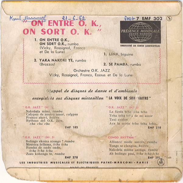 A-01 Baila, cha cha cha (J. Essous) - Chanté en espagnol B-01 Jalousie, cha cha cha (Nino) - Chanté en espagnol Orchestre Rock-A-Mambo: Chant: Kabasele - Rossignol EP total time: xx:xx |