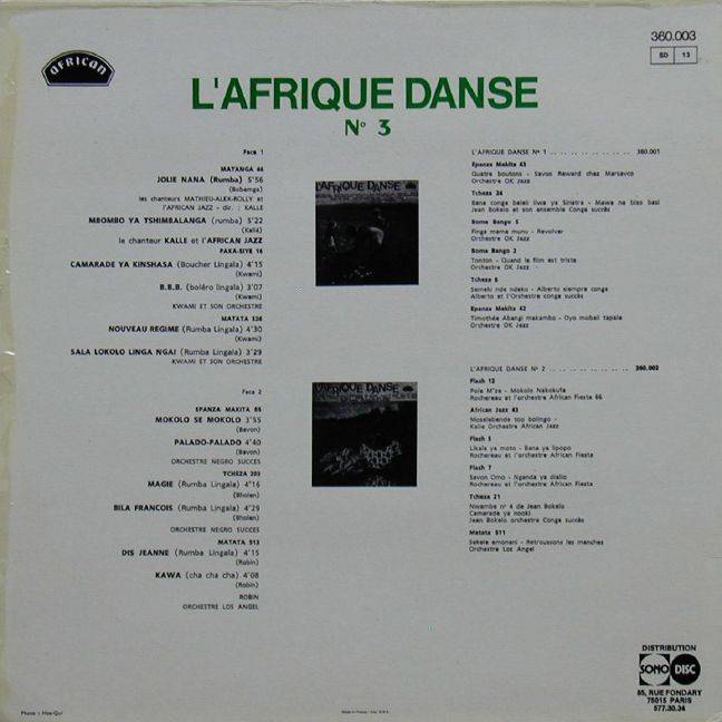 Various [Kalle - Kwami -Negro Succès] L'Afrique Danse [No 3] A-01 Jolie Nana (Bombenga) [5:56] Kalle et l'Orchestre African Jazz A-02 Mbombo ya Tsimbalanga (Kalle) [5:52] Kalle et l'Orchestre African Jazz A-03 Camarade ya Kinshasa (Kwami) [4:15] Kwami et son Orchestre A-04 B.B.B. (Kwami) [3:07] Kwami et son Orchestre A-05 Noveau Regime (Kwami) [4:30] Kwami et son Orchestre A-06 Sala Lokolo Linga Ngai () [3:29] Kwami et son Orchestre B-01 Mokolo se Mokolo (Bavon) [3:55] Negro Succes B-02 Palado-Palado (Bavon) [4:40] Negro Succes B-03 Magie (Bholen) [4:16] Negro Succes B-04 Bial Francois Camarade ya noki (Bholen) [4:29] Negro Succes B-05 Dis Jeanne (Robin) [4:15] Robin Orchestre Los Angel B-06 Kawa (Robin) [4:08] Robin Orchestre Los Angel LP total time: 00:00 |