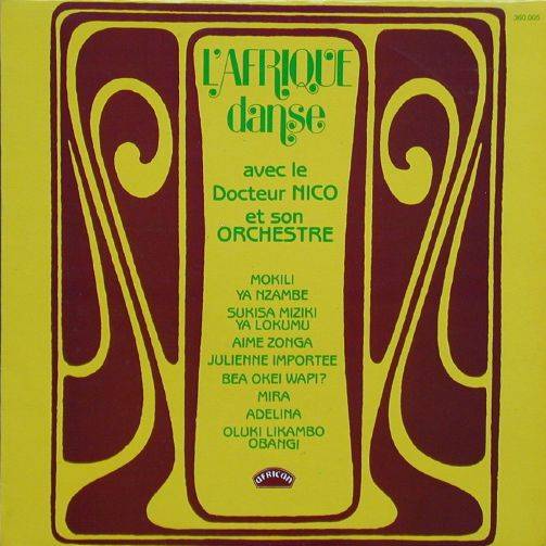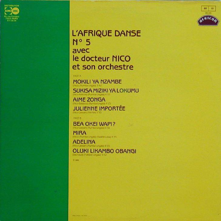 Docteur Nico et son Orchestre L'Afrique Danse N° 5 A-01 Mokili ya nzambe (Nico) [Rumba Lingala] 3:42 Docteur Nico et son Orchestre A-02 Sukisa miziki ya lokumu (Nico - Anticos) [Rumba Lingala] 4:07 Docteur Nico et son Orchestre A-03 Aime zonga (Nico - Balabou) [Rumba Lingala] 4:25 Docteur Nico et son Orchestre A-04 Julienne importée (Nico - Lassan) [Kiri-Kiri] 5:50 Docteur Nico et son Orchestre B-01 Bea okei wapi? (Nico - Lassan) [Rumba Lingala] 4:34 Docteur Nico et son Orchestre B-02 Mira (Nico) [Rumba Lingala] [Swahili-Luba] 3:35 Docteur Nico et son Orchestre B-03 Adelina (Nico - Lassan) [Rumba Lingala] 4:35 Docteur Nico et son Orchestre B-04 Oluki likambo obangi (Dechaud) [Folklore Lingala] 5:32 Docteur Nico et son Orchestre LP total time: 00:00 |