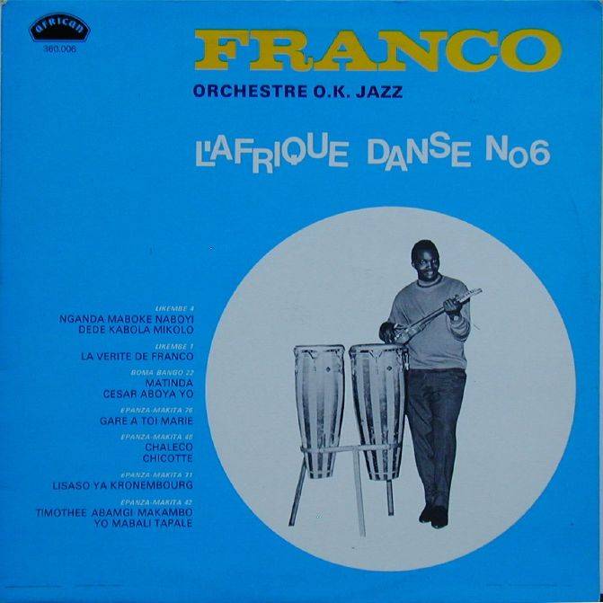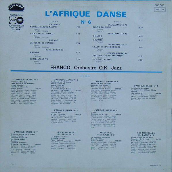 Franco - OrchestreO.K. Jazz L'Afrique Danse N° 6 A-01 Nganda Maboke Naboyi (Franco) [Rumba - Lingala] [Likembe 4] 4:39 Franco Orchestre O.K.Jazz A-02 Dede Kabola Mikolo (Franco) [Rumba - Lingala] [Likembe 4] 6:11 Franco Orchestre O.K.Jazz A-03 La Verite De Franco (Franco) [Rumba - Lingala] [Likembe 1] 5:04 Franco Orchestre O.K.Jazz A-04 Matinda (Franco) [Rumba] [Boma Bango 22] 5:18 Franco Orchestre O.K.Jazz A-05 Cesar Aboya Yo (Franco) [Rumba] [Boma Bango 22] 5:20 Franco Orchestre O.K.Jazz B-01 Gare A Toi Marie (Franco) [Rumba] [Epanza-Makita 76] 5:10 Franco & Orchestre O.K.Jazz B-02 Chaleco (Franco) [Epanza-Makita 48] 4:53 Franco & Orchestre O.K.Jazz B-03 Chicotte(Franco) [Epanza-Makita 48] 4:25 Franco & Orchestre O.K.Jazz B-04 Lisaso Yo Kronembourg (Franco) [Rumba] [Epanza-Makita 71] 5:53 Franco & Orchestre O.K.Jazz B-05 Timothee Abamgi Makambo (Franco) [Epanza-Makita 42] 4:48 Franco & Orchestre O.K.Jazz B-06 Yo Mabali Tapale (Franco) [Epanza-Makita 42] 3:50 Franco & Orchestre O.K.Jazz LP total time: 00:00 |