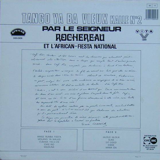 Seigneur Rochereau et l'African Fiesta National Tango ya ba vieux Kalle N° 2 A-01 Minge Rumba Fiesta [x](X) X:XX Seigneur Rochereau et L'African Fiesta National A-02 Molangi Ya Malasi [x](X) X:XX Seigneur Rochereau et L'African Fiesta National A-03 Cubana Vis-A-Vis [x](X) X:XX Seigneur Rochereau et L'African Fiesta National A-04 Cafe Rio [x](X) X:XX Seigneur Rochereau et L'African Fiesta National A-05 Majolina [x](X) X:XX Seigneur Rochereau et L'African Fiesta National B-01 Jaloux Jaloux [x](X) X:XX Seigneur Rochereau et L'African Fiesta National B-02 Suke [x](X) X:XX Seigneur Rochereau et L'African Fiesta National B-03 Dit Coco [x](X) X:XX Seigneur Rochereau et L'African Fiesta National B-04 Djeke [x](X) X:XX Seigneur Rochereau et L'African Fiesta National B-05 Mama Ida [x](X) X:XX Seigneur Rochereau et L'African Fiesta National LP total time: 00:00 |