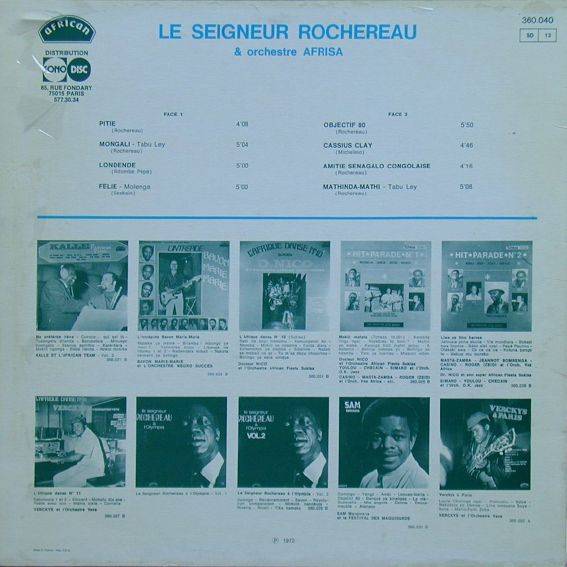 Le Seigneur Rochereau & Orchestre Afrisa Le Seigneur Rochereau A-01 Pitie [x](Rochereau) 4:08 Le Seigneur Rochereau & Orchestre Afrisa A-02 Mongali - Tabu Ley [x](Rochereau) 5:04 Le Seigneur Rochereau & Orchestre Afrisa A-03 Londende [x](Ndombe Pepe) 5:00 Le Seigneur Rochereau & Orchestre Afrisa A-04 Felie - Molenga [x](Seskain) 5:00 Le Seigneur Rochereau & Orchestre Afrisa B-01 Objectif 80 [x](Rochereau) 5:50 Le Seigneur Rochereau & Orchestre Afrisa B-02 Cassius Clay [x](Michelino) 4:46 Le Seigneur Rochereau & Orchestre Afrisa B-03 Amitie Senegalo Congolaise [x](Rochereau) 4:16 Le Seigneur Rochereau & Orchestre Afrisa B-04 Mathinda-Mathi - Tabu Ley [x](Rochereau) 5:08 Le Seigneur Rochereau & Orchestre Afrisa LP total time: 00:00 |