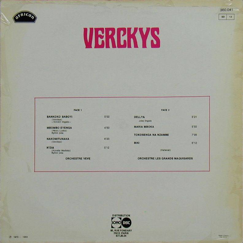 Verckys, Orchestre Veve, Orchestre Les Grands Maquisards Unknown title A-01 Bankoko (Verckys) [Kiri-Kiri Lingala] 5:02 Orchestre Veve A-02 Mbombo (Nkalu Luaka) [Rythm Jobs] 4:50 Orchestre Veve A-03 Nakomitunaka (Verckys) 6:23 Orchestre Veve A-04 N’Dia (Kunsita Matadia) [Rythm Jobs] 5:12 Orchestre Veve B-01 Dellya (Dalienst) [Jobs Lingala] 5:21 Orchestre Les Grands Maquisards B-02 Maria Mboka (Dalienst) 5:55 Orchestre Les Grands Maquisards B-03 Tokosenga Na Nzambe (Dalienst) 7:09 Orchestre Les Grands Maquisards B-04 Biki (Dalienst) 5:12 Orchestre Les Grands Maquisards LP total time: 00:00 |