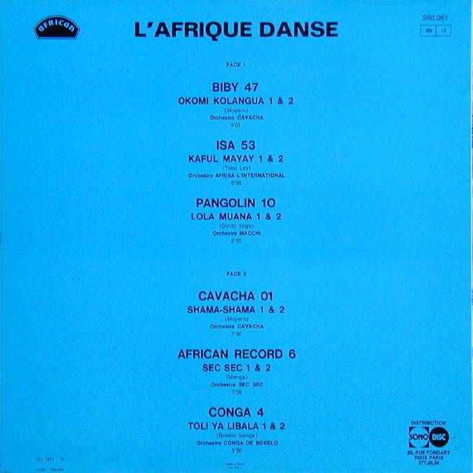 Various Artists L'Afrique Danse A-01 Okomi Kolangua 1 & 2 [x] (Mopero) 8:01 Orchestre Cavacha [Biby 47] A-02 Kaful Mayay 1 & 2 [x] (Tabu Ley) 8:08 Orchestre Afrisa L'International [Isa 53] A-03 Lola Muana 1 & 2 [x] (Dindo Yogo) 8:00 Orchestre Macchi [Pangolin 10] B-01 Shama-Shama 1 & 2 [x] (Mopero) 7:30 Orchestre Cavacha [Cavacha 01] B-02 Sec Sec 1 & 2 [x] (Menga) 7:09 Orchestre Sec Sec [African Record 6] B-03 Toli ya libala 1 & 2 [x] (Bokelo Isenge) 8:30 Orchestre Conga de Boleko [Conga 4] LP total time: 00:00 |