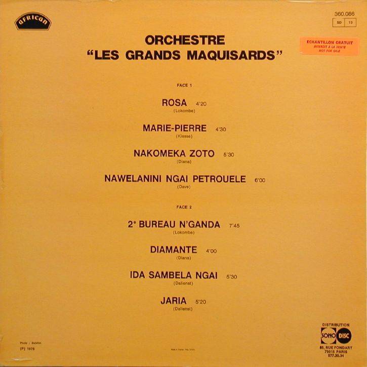 Les Grands Maquisards Orchestre "Les Grands Maquisards" A-01 Rosa (Lokombe) 4:20 Orchestre Les Grands Maquisards A-02 Marie-Pierre (Kiesse) 4:30 Orchestre Les Grands Maquisards A-03 Nakomeka Zoto (Diana) 5:30 Orchestre Les Grands Maquisards A-04 Nawelanini Ngai Petrouele (Dave) 6:00 Orchestre Les Grands Maquisards B-01 2e Bureau N’Ganda (Lokombe) 7:45 Orchestre Les Grands Maquisards B-02 Diamante (Diana) 4:00 Orchestre Les Grands Maquisards B-03 Ida Sambeta Ngai (Dalienst) 5:30 Orchestre Les Grands Maquisards B-04 Jaria (Dalienst) 5:20 Orchestre Les Grands Maquisards LP total time: 00:00 |