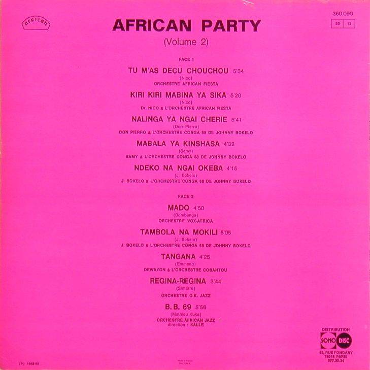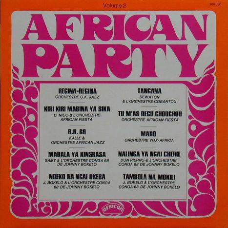 68, Cobantou etc.] African Party - Volume 2 A-01 Tu m'as decu Chouchou [x](Nico) 5:34 Orchestre African Fiesta A-02 Kiri Kiri mabina ya Sika [x](Nico) 5:20 Dr. Nico & L'Orchestre African Fiesta A-03 Nalinga Ya Ngai Cherie [x](Don Pierro) 5:41 Don Pierro & L'Orchestre Conga 68 De Johnny Bokelo A-04 Mabala ya Kinsahsa [x](Samy) 4:32 Samy & L'Orchestre Conga 68 De Johnny Bokelo A-05 Ndeko Na Ngai Okeba [x](J. Bokelo) 4:15 J. Bokelo & L'Orchestre Conga 68 De Johnny Bokelo B-01 Mado [x](Bombenga) 4:50 Orchestre Vox-Africa B-02 Tambola Na Mokili [x](J. Bokelo) 5:05 J. Bokelo & L'Orchestre Conga 68 De Johnny Bokelo B-03 Tangana [x](Emmano) 4:25 Dewayon & L'Orchestre Cobantou B-04 Regina-Regina [x](Simarro) 3:44 Orchestre O.K. Jazz B-05 B. B. 69 [x](Mathieu Kuka)[Direction: Kalle] 5:56 Orchestre African Jazz LP total time: 00:00 |