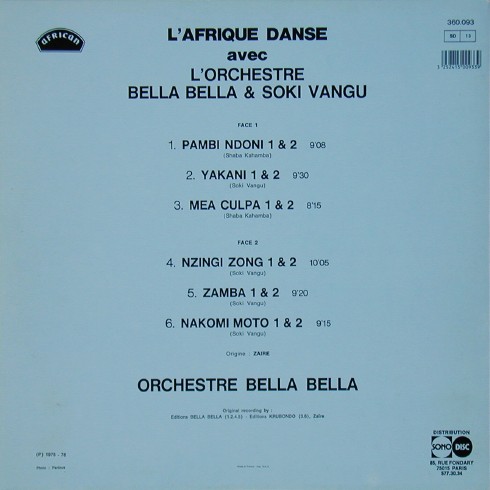 L'Orchestre Bella-Bella & Soki Vangu L'Afrique danse avec l'Orchestre Bella-Bella & Soki Vangu A-01 Pambi Ndondi 1 º 2 [P.1975] (Shaba Kahamba) 9:08 L’Orchestre Bella Bella & Soki Vangu A-02 Yakani 1 º 2 [P.1975] (Soki Vangu) 9:30 L’Orchestre Bella Bella & Soki Vangu [NIL] A-03 Mea Culpa 1 º 2 [P.1976] (Shaba Kahamba) 8:15 L’Orchestre Bella Bella & Soki Vangu B-01 Nzingi Zong 1 º 2 [P.1975] (Soki Vangu) 10:05 L’Orchestre Bella Bella & Soki Vangu B-02 Zamba 1 º 2 [P.1975] (Soki Vangu) 9:20 L’Orchestre Bella Bella & Soki Vangu B-03 Nakomi Moto 1 º 2 [P.1976] (Soki Vangu) 9:15 L’Orchestre Bella Bella & Soki Vangu [NIL] LP total time: 00:00 |