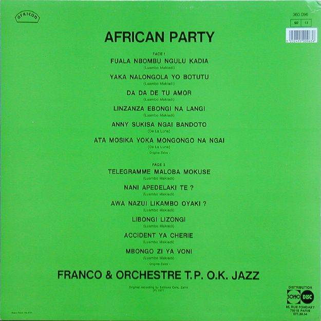 Franco & Orchestre T.P.O.K. Jazz African Party - Franco & Orchestre T.P.O.K. Jazz A-01 Fuala Ndombu Ngulu Kadia [x] (Luambo Makiadi) 2:30 Franco & Orchestre T.P.O.K.Jazz A-02 Yaka Nalongola Yo Botutu [x] (Luambo Makiadi) 2:30 Franco & Orchestre T.P.O.K.Jazz A-03 Da Da De Tu Amor [x] (Luambo Makiadi) 2:33 Franco & Orchestre T.P.O.K.Jazz A-04 Linzanza Ebongi Na Langi [x] (Luambo Makiadi) 2:42 Franco & Orchestre T.P.O.K.Jazz A-05 Anny Sukisa Ngai Bandoto [x] (De La Lune) 2:20 Franco & Orchestre T.P.O.K.Jazz A-06 Ata Mosika Yoka Mongongo Na Ngai [x] (De La Lune) 2:47 Franco & Orchestre T.P.O.K.Jazz B-01 Telegramme Maloba Mokuse [x] (Luambo Makiadi) 2:42 Franco & Orchestre T.P.O.K.Jazz B-02 Nani Apedelaki Te? [x] (Luambo Makiadi) 2:25 Franco & Orchestre T.P.O.K.Jazz B-03 Awa Nazui Likambo [x] (Luambo Makiadi) 2:40 Franco & Orchestre T.P.O.K.Jazz B-04 Libongi Lizongi [x] (Luambo Makiadi) 2:35 Franco & Orchestre T.P.O.K.Jazz B-05 Accident Ya Cheri [x] (Luambo Makiadi) 2:40 Franco & Orchestre T.P.O.K.Jazz B-06 Mbongo Zi Ya Voni [x] (Luambo Makiadi) 2:42 Franco & Orchestre T.P.O.K.Jazz LP total time: 00:00 |