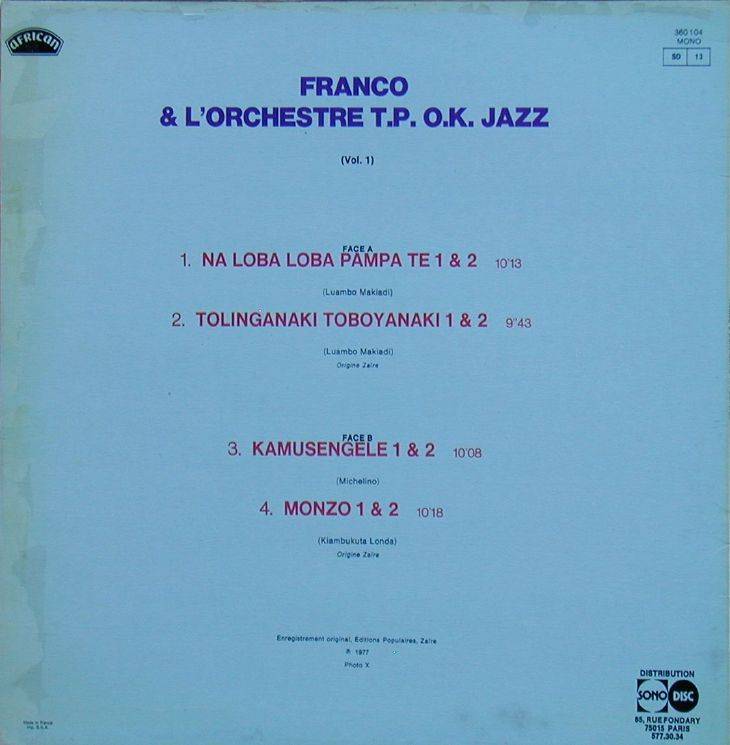 *A-02 spelled : Na Loba Loba Pampa Te on the cover ** B-02 Monzo 1 º 2 (Kiambukuta Londa)10:18 [longer version than CD’s] LF. Any more information about this record is most welcome. LF mailto:disco@bolingo.org |