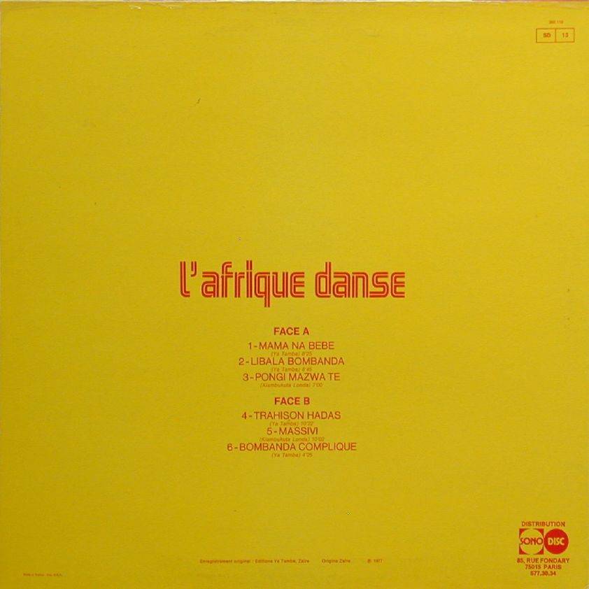 Ya Tamba L'Afrique danse avec Ya Tamba A-01 Mama Na Bebe [x] (Ya Tamba) 8:25 Ya Tamba [BOP 011] A-02 Libala Bombanda [x] (Ya Tamba) 8:45 Ya Tamba A-03 Pongi Mazwa Te [x] (Kiambukuta Londa) 7:00 Ya Tamba [BOP 011] B-01 Trahison Hadas [x] (Ya Tamba) 10:22 Ya Tamba B-02 Massivi [x] (Kiambukuta Londa) 10:02 Ya Tamba [BOP 011] B-03 Bombanda Complique [x] (Ya Tamba) 4:25 Ya Tamba [BOP 011] LP total time: 00:00 |