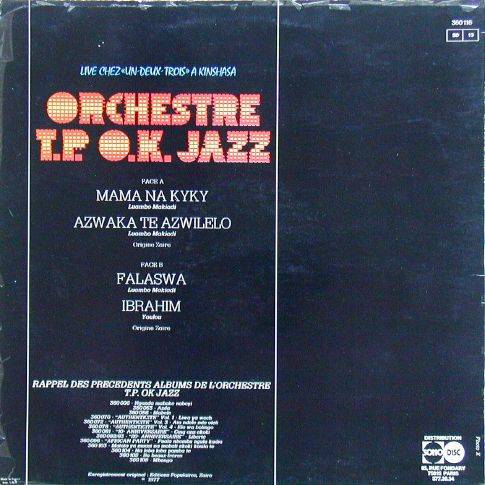 Orchestre T.P.O.K. Jazz Live chez «Un-deux-trois» à Kinshasa A-01 Mama na kyky [x] (Luambo Makiadi) 9:00 Orchestre T.P. O.K. Jazz [CD 36556 shorter version! WIREM longer] A-02 Azwaka te azwilelo [x] (Luambo Makiadi) 10:15 Orchestre T.P. O.K. Jazz B-01 Falaswa [x] (Luambo Makiadi) 10:09 Orchestre T.P. O.K. Jazz [CD 36556] B-02 Ibrahim [x] (Youlou) 8:55 Orchestre T.P. O.K. Jazz LP total time: 00:00 |