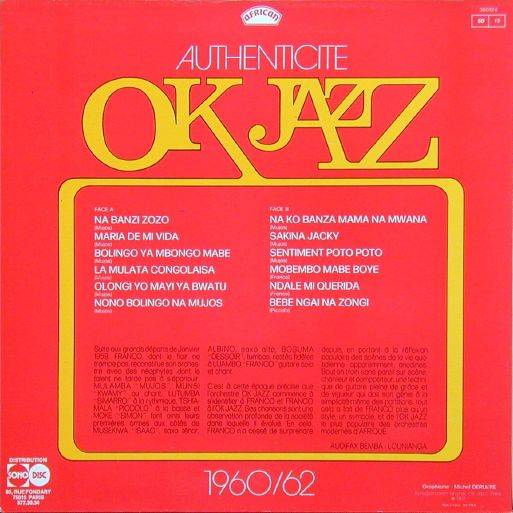 OK Jazz Autenticite OK Jazz 1960/62 A-01 Na Banzi Zozi (Mujos) X:XX OK Jazz A-02 Maria De Mi Vida (Mujos) X:XX OK Jazz (NIL) A-03 Bolingo Ya Mbongo Mabe (Mujos) X:XX OK Jazz A-04 La Mulata Congolaisa (Mujos) X:XX OK Jazz A-05 Olongi Yo Mayi Ya Bwatu (Mujos) X:XX OK Jazz (NIL) A-06 Nono Bolingo Na Mujos (Mujos) X:XX OK Jazz B-01 Na Ko Banza Mama Na Bwana (Mujos) X:XX OK Jazz B-02 Sakina Jacky (Mujos) X:XX OK Jazz B-03 Sentiment Poto Poto (Mujos) X:XX OK Jazz B-04 Mobembo Mabe Boye (Franco) X:XX OK Jazz B-05 Ndale Mi Querida (Franco) X:XX OK Jazz B-06 Bebe Ngai Na Zongi (Piccolo) X:XX OK Jazz LP total time: 00:00 |
