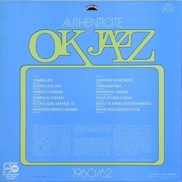 Unknown Artists Unknown title A-01 Yamba Leo (Simaro) 2:50 OK Jazz [CD 36508] A-02 Gueno Cha-Cha (Simaro) 2:45 OK Jazz [700:014-A] A-03 Mibeko Ya Mama (Kwamy) 2:45 OK Jazz [CD 36508] A-04 Sabina El Kwamy (Kwamy) 2:45 OK Jazz [CD 36508] A-05 Kitoko Ezali Mayele Te (Kwamy) 2:46 OK Jazz [700:014-A] A-06 Mabanzo Makeyi Mosika (Kwamy) 2:40 OK Jazz [CD 36508] B-01 Kokende Mabe Boye (Mujos) 2:46 OK Jazz [CD 36508] B-02 Teben Matida (Kwamy) 2:40 OK Jazz [CD 36508] B-03 Mwasi Na Lingaki (Isaac Musekiwa) 2:40 OK Jazz [CD 36508] B-04 Kaya Oyokela Ngai (Franco) 2:40 OK Jazz [CD 36508] B-05 Bato Ya Mabe Batondi Mboka (Franco) 2:40 OK Jazz [CD 36508] B-06 Nous Deux Moziki Ya OK (Piccolo) 2:45 OK Jazz [CD 36508] LP total time: 00:00 |