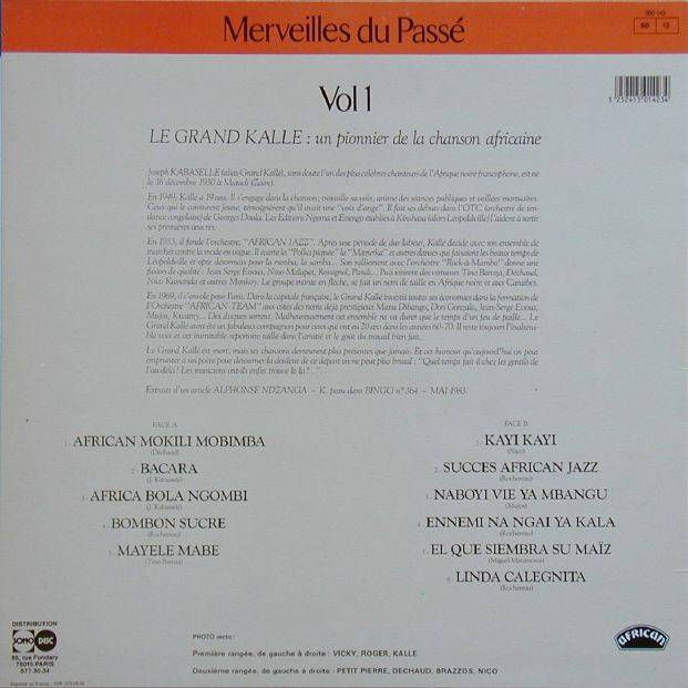 Joseph Kabasele et l'African Jazz Merveilles du Passé (1960) Hommage au Grand Kalle vol. 1 A-01 African Mobili Mobimba [1960] (Dechaud) X:XX Joseph Kabasele et l’African Jazz A-02 Bacara [1960] (Grand Kalle) 2:46 Joseph Kabasele et l’African Jazz A-03 Africa bola ngombi [1960] (Grand Kalle) 2:37 Joseph Kabasele et l’African Jazz A-04 Bonbon sucre * [1960] (Rocheraeu) 2:42 Joseph Kabasele et l’African Jazz A-05 Mayele mabe [1960] (Tino Barosa) 2:46 Joseph Kabasele et l’African Jazz B-01 Kayi kayi [1960] (Nico) 2:41 Joseph Kabasele et l’African Jazz B-02 Succès african jazz [1960] (Rocheraeu) 3:54 Joseph Kabasele et l’African Jazz B-03 Naboyi vie ya mbangu [1960] (Mujos) 2:42 Joseph Kabasele et l’African Jazz B-04 Ennemi na ngai ya kala [1960] (Rocheraeu) 2:44 Joseph Kabasele et l’African Jazz B-05 El que siembra su maïz [1960] (Miguel Matamoros) 4:03 Joseph Kabasele et l’African Jazz B-06 Linda caleguita [1960] (Rocheraeu) 2:47 Joseph Kabasele et l’African Jazz LP total time: 00:00 |