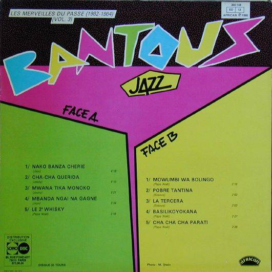 Bantous Jazz Les Merveilles du Passé (1962-1964) VOL. 3 A-01 Nako Banza Cherie [x](Jojo) 4'18 Bantous-Jazz [X] A-02 Cha-Cha Querida [x](Jacky) 4'10 Bantous-Jazz [X] A-03 Mwana Tika Monoko [x](Jacky) 3'21 Bantous-Jazz [X] A-04 Mbanda ngai na Gagne [x](Jojo) 3'34 Bantous-Jazz [X] A-05 Le 2e Whisky [x](Papa Noël) 3'16 Bantous-Jazz [X] B-01 Mowumbi wa bolingo [x](Papa Noël) 3'16 Bantous-Jazz [X] B-02 Pobre Tantina [x](Essous) 2'52 Bantous-Jazz [X] B-03 La Tercera [x](Essous) 3'02 Bantous-Jazz [X] B-04 Basilikoyokana [x](Papa Noël) 3'27 Bantous-Jazz [X] B-05 Cha Cha Cha parati [Papa Noël](X) 3'28 Bantous-Jazz [X] LP total time: 00:00 |