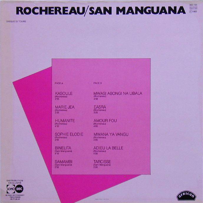 Rochereau / San Manguana l'African Fiesta National "Belle Epoque" Vol. III A-01 Kasoule (Rochereau) 4:00 Rochereau/Sam Manguana & l'Orchestre African Fiesta National A-02 Marie Jea (Rochereau) 3:45 Rochereau/Sam Manguana & l'Orchestre African Fiesta National A-03 Humanite (Rochereau) 4:50 Rochereau/Sam Manguana & l'Orchestre African Fiesta National A-04 Sophie Elodie (Rochereau ) 4:35 Rochereau/Sam Manguana & l'Orchestre African Fiesta National A-05 Binelita (Sam Manguana) X:XX Rochereau/Sam Manguana & l'Orchestre African Fiesta National A-06 Samambi (Sam Manguana) X:XX Rochereau/Sam Manguana & l'Orchestre African Fiesta National B-01 Mwasi Abongi Na Libala (Rochereau) 4:50 Rochereau/Sam Manguana & l'Orchestre African Fiesta National B-02 Easra (Rochereau) 4:55 Rochereau/Sam Manguana & l'Orchestre African Fiesta National B-03 Amour Fou (Rochereau) 4:05 Rochereau/Sam Manguana & l'Orchestre African Fiesta National B-04 Mwana Ya Vangu (Rochereau) 6:05 Rochereau/Sam Manguana & l'Orchestre African Fiesta National B-05 Adieu La Belle (Rochereau) 2:15 Rochereau/Sam Manguana & l'Orchestre African Fiesta National B-06 Tarcisse (Sam Manguana) 2:15 Rochereau/Sam Manguana & l'Orchestre African Fiesta National LP total time: 00:00 |