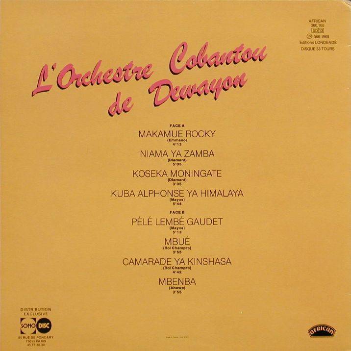 L'Orchestre Cobantou de Dewayon Merveilles du Passé 1968 1969 A-01 Makamue Rocky (Emmano) 4:13 L’Orchestre Cobantou de Dewayon A-02 Niama Ya Zamba (Diamant) 5:05 L’Orchestre Cobantou de Dewayon A-03 Koseka Moningate (Diamant) 3:35 L’Orchestre Cobantou de Dewayon A-04 Kuba Alphonse Ya Himalaya (Mayos) 5:44 L’Orchestre Cobantou de Dewayon B-01 Pélé Lembé (Mayos) 5:13 L’Orchestre Cobantou de Dewayon B-02 Mbué (Roi Champro) 3:55 L’Orchestre Cobantou de Dewayon B-03 Camarade Ya Kinshasa (Roi Champro) 4:42 L’Orchestre Cobantou de Dewayon B-04 Mbenba (Abewe) 3:53 L’Orchestre Cobantou de Dewayon LP total time: 00:00 |