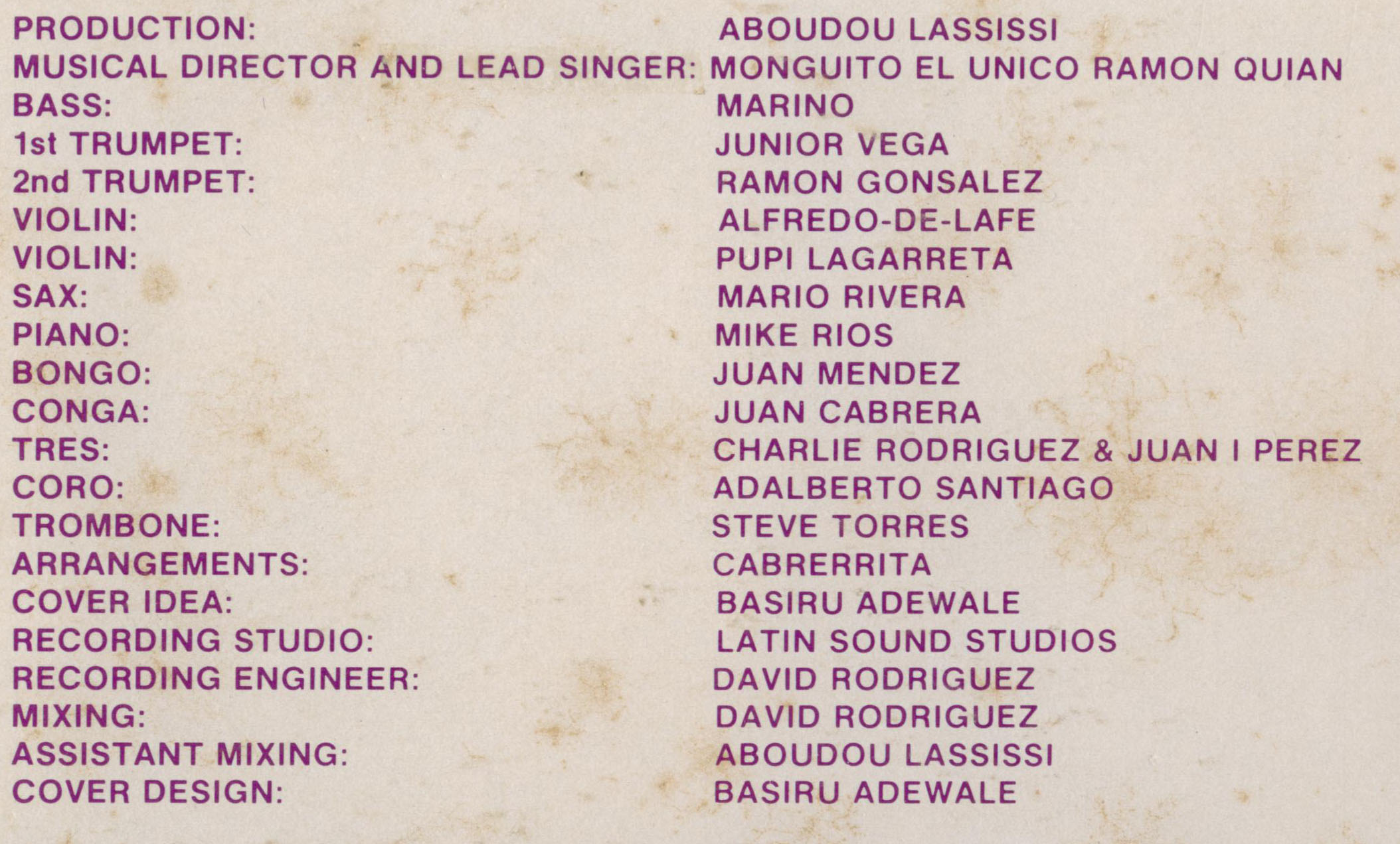 DavidN also wrote: The album was recorded in Nov. 1982 at Studio JBZ in Abidjan. Lead vcls: Philo Kola & Zitany Neil. Gtrs: Antoine Manana & Lokassa Ya Mbongo. Bass: Hilaire Penoi. Drums: Ringo Moya. Tumba: Pierre Houon & Lola Muana.