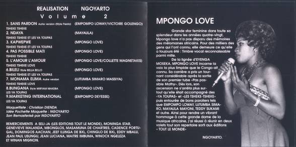 M'Pongo Love & Tcheke Tcheke Sans Pardon - Volume 2 01 Sans Pardon - Autre version (Style Fiesta) [x] (Empompo Loway | Victoire Golengo) 08:30 Mpongo Love & Tcheke Tcheke [ LP-360102] 02 Ndaya [x] (Mayaula) 09:02 Mpongo Love & Tcheke Tcheke et Les Ya Toupas [ LP-360102] 03 Kapwepwe [x] (Mpongo Love) 05:22 Mpongo Love & Tcheke Tcheke et Les Ya Toupas [LP-360102] 04 Pas Possible Mati [x] (Mpongo Love) 05:24 Mpongo Love [LP-360102] 05 L'Amour L'Amour [x] (Mpongo Love | Collette Magnetakis) 04:31 Mpongo Love & Tcheke Tcheke et [NIL] 06 Bileli [x] (Mpongo Love) 05:14 Mpongo Love [LP-360102] 07 Monama Elima [x] Lutumba Simaro Massiya) 09:11 Mpongo Love & Tcheke Tcheke Love [LP-360102] 08 Bungana [x] (Mpongo Love) 05:04 Mpongo Love & Les Ya Toupas [LP-360102] 09 Marketing International [x] (Mpongo Love) 05:01 Mpongo Love & Les Ya Toupas [LP-360102] CD total time: 00:00 |