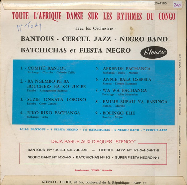 A-01 Comité Bantou [Patchanga - Cha cha] (Celestine Celio) x:xx Bantous [CD] B-01 Aprende pachanga [Patchanga - Dicky] (Moreno) x:xx Batchichas [CD][NIL!] LP total time: xx:xx |