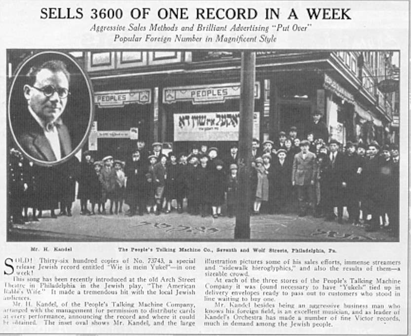 Mr. H. Kandel, of the People's Talking Machine Company, arranged with the management for permission to distribute cards at every performance, announcing the record and where it could be obtained. The insert oval shows Mr. Kandel, and the large illustration pictures some of his sales efforts, immense streamers and "sidewalk hieroglyphics," and also the results of them a sizeable crowd.At each of the three stores of the People's Talking Machine Company it was found necessary to have "Yukels" tied up in delivery envelopes ready to pass out to customers who stood in line waiting to buy one.